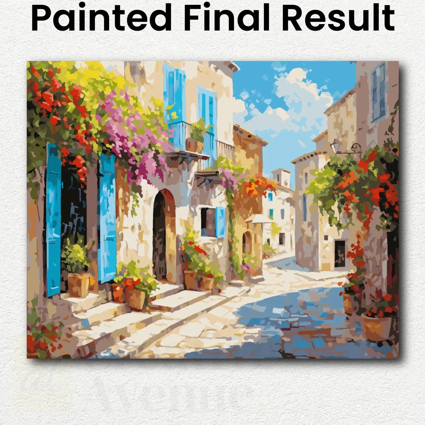 framed artwork displaying the rich pigments painting by number kits and their premium quality acrylic paints. the image features a city of different colors and the preservation of vivid colors of the art work